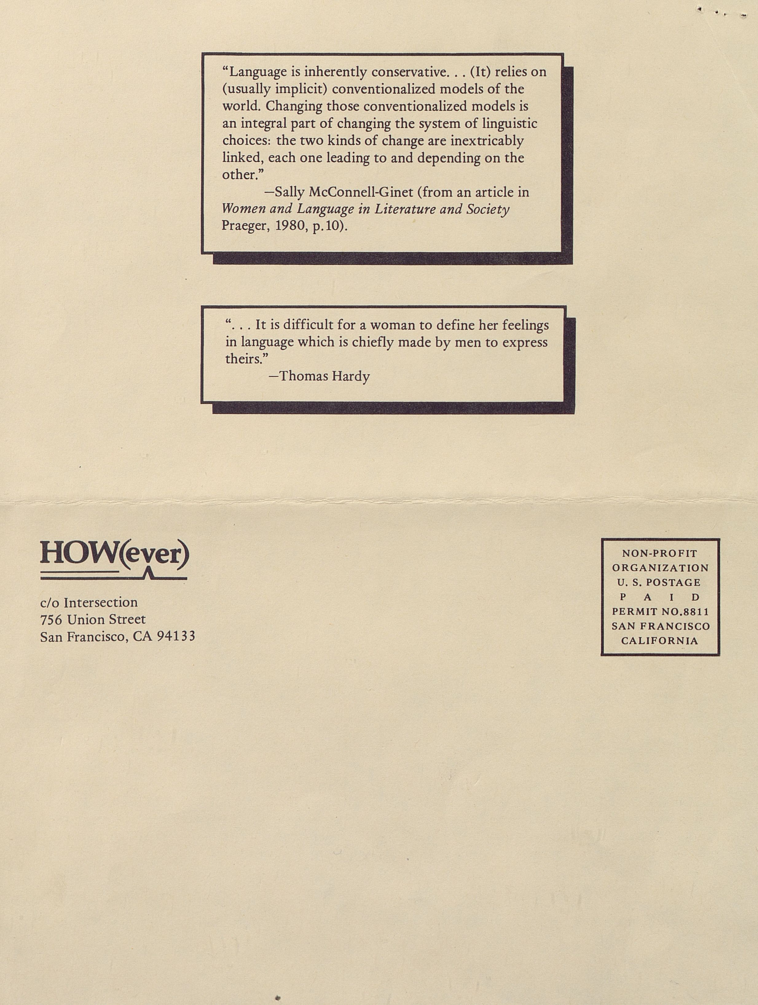 HOW(ever) is available in a first series of four issues, for $5. Subscription checks should go to: HOW(ever), c/o Jaffer, 871 Corbett, San Francisco, CA 94131. All editorial correspondence can be sent to: Fraser, 554 Jersey St., San Francisco, CA 94114. Original poetry manuscripts will be considered at the beginning of the second series.