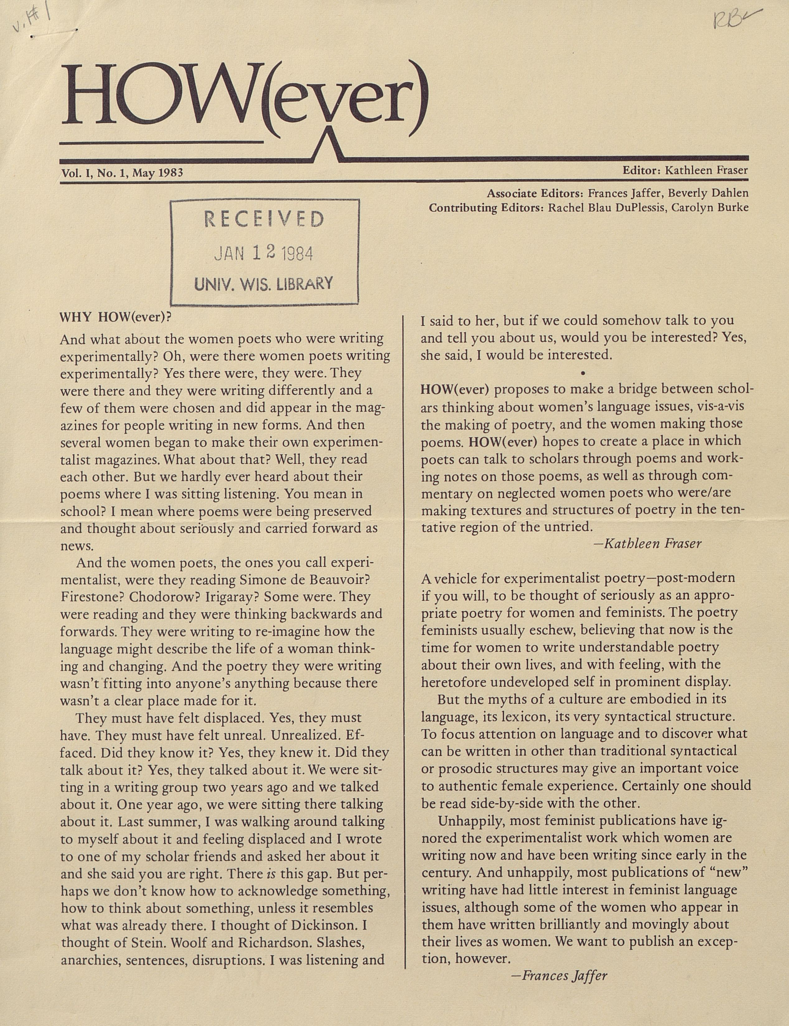 HOW(ever) proposes to make a bridge between scholars thinking about women's language issues, vis-a-vis the making of poetry, and the women making those poems. HOW(ever) hopes to create a place in which poets can talk to scholars through poems and working notes on those poems, as well as through commentary on neglected women poets who were/are making textures and structures of poetry in the tentative region of the untried.