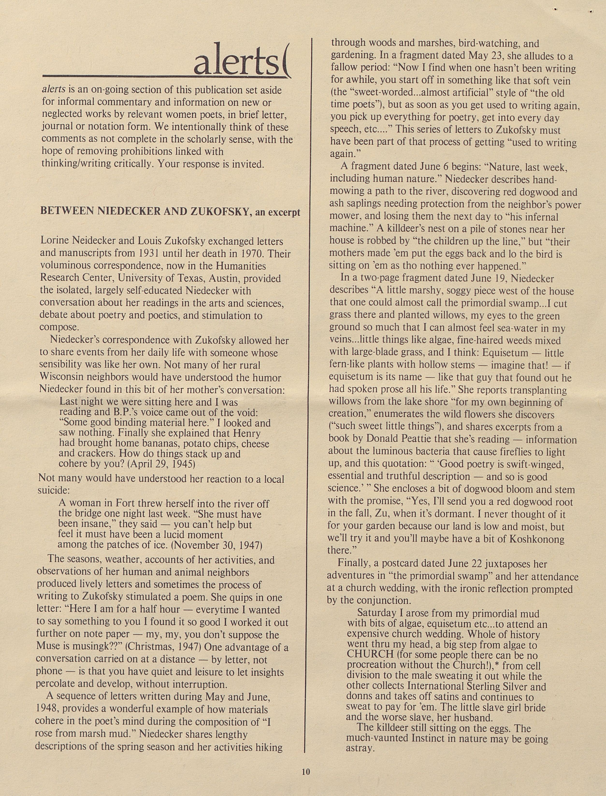 alerts is an on-going section of this publication set aside for informal commentary and information on new or neglected works by relevant women poets, in brief letter, journal, or notation form. We intentionally think of these comments as not complete in the scholarly sense, with the hope of removing prohibitions linked with thinking/writing critically. Your response is invited.